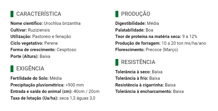 O capim Ruziziensis é uma gramínea indicada para bovinos de recria e engorda. Devido a sua qualidade de forragem, além do pastejo direto, pode ser utilizada para prática de fenação. A Ruziziensis tem bastante pelos em todas as partes da planta e pode ser feita em consorciação com leguminosas. Tendo também capacidade na formação de palhada para plantio direto de culturas anuais, como soja e milho.